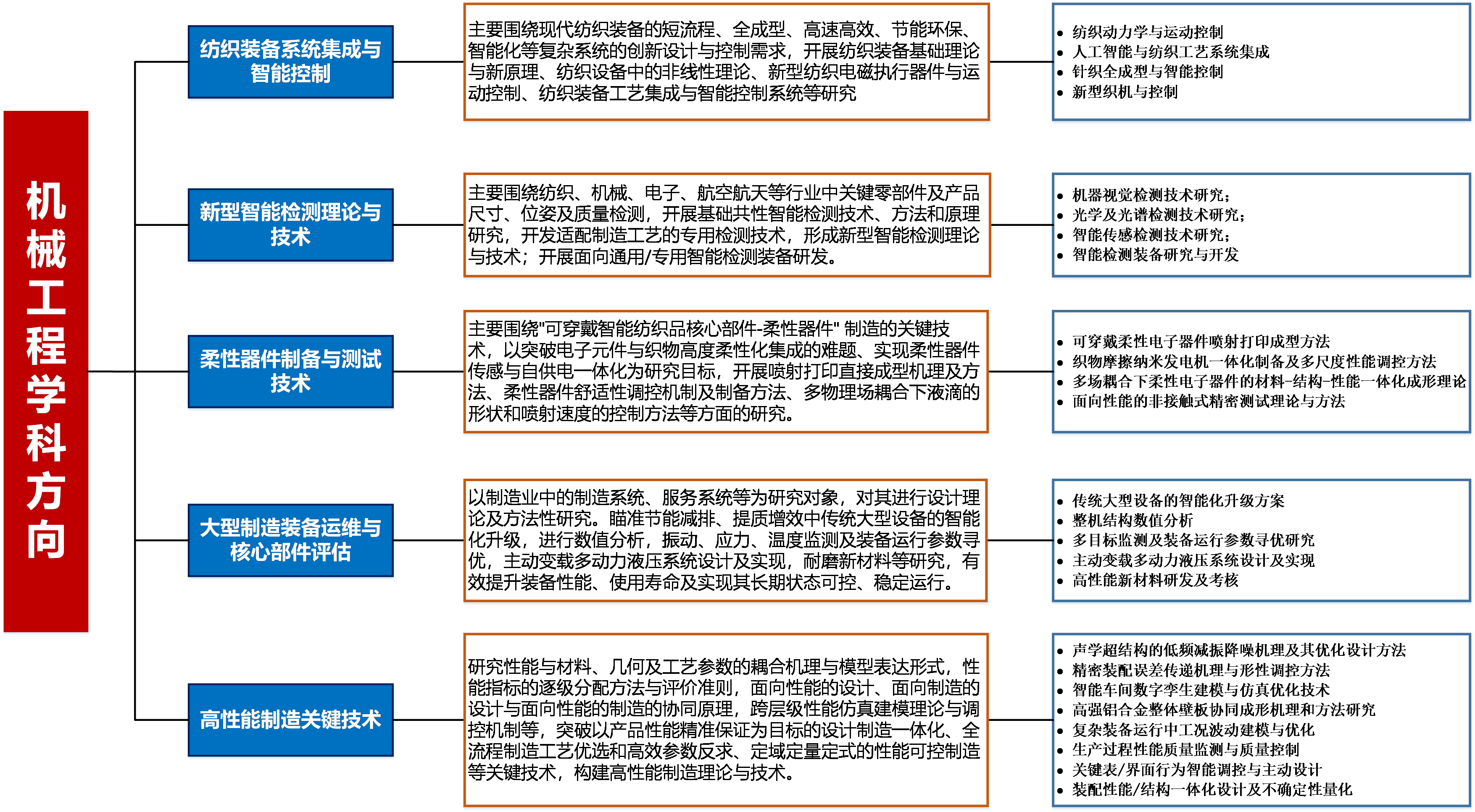 经过50余年的发展,本学科拥有“四主体一联合”新型校企研发平台—陕西省智能纺织装备研究院、西安市现代智能装备重点实验室等省部级学科平台,形成了以“纺织+”“智能+”为特色,聚焦纺织装备系统集成与智能控制、新型智能检测理论与技术、柔性器件制备与测试技术、大型制造装备运维与核心部件评估、高性能制造关键技术等五大学科方向,致力于纺织机械共性及关键技术研究。