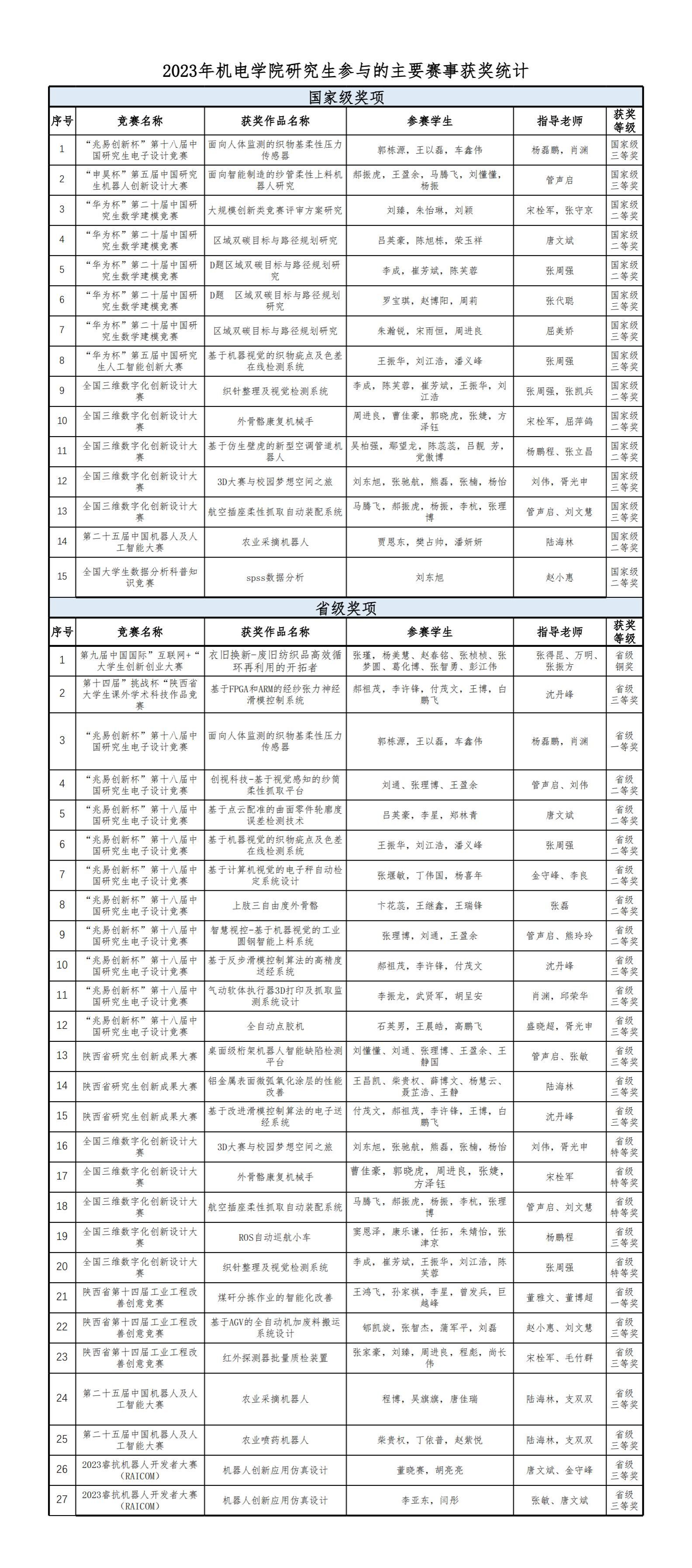 2023年机电学院研究生参与的主要赛事获奖统计