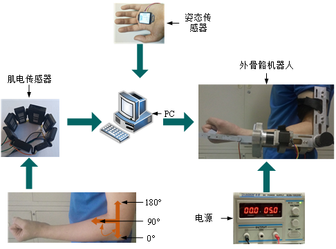 外骨骼机器人上肢运动意图识别和柔性驱动器设计已成为国内外学者研究的热点问题之一。此论文提出了一种能提高被试者适应能力的反向传播(BP)神经网络模式识别方法,建立的分类模型可对不同被试者自选离散动作分类。提出了一种上肢连续运动估计方法,较好地解决了传统利用人体上肢肌肉模型,估计连续运动角度参数过多和误差大的弊端,设计的三自由度外骨骼机器人模型和控制过程如图1所示。提出了基于磁流变效应、可快速响应且具有较大力矩输出范围的柔性驱动器设计方法,以增强上肢外骨骼机器人运动过程中柔性和人机交互安全性。上述关于上肢外骨骼机器人设计、离散动作识别和肘部关节柔性驱动器设计研究成果,为本项目继续从事手指外骨骼机器人设计、基于表面肌电信号的手指连续运动意图识别和控制机理等研究方面,奠定了良好基础,部分研究成果对项目的开展有直接指导意义。