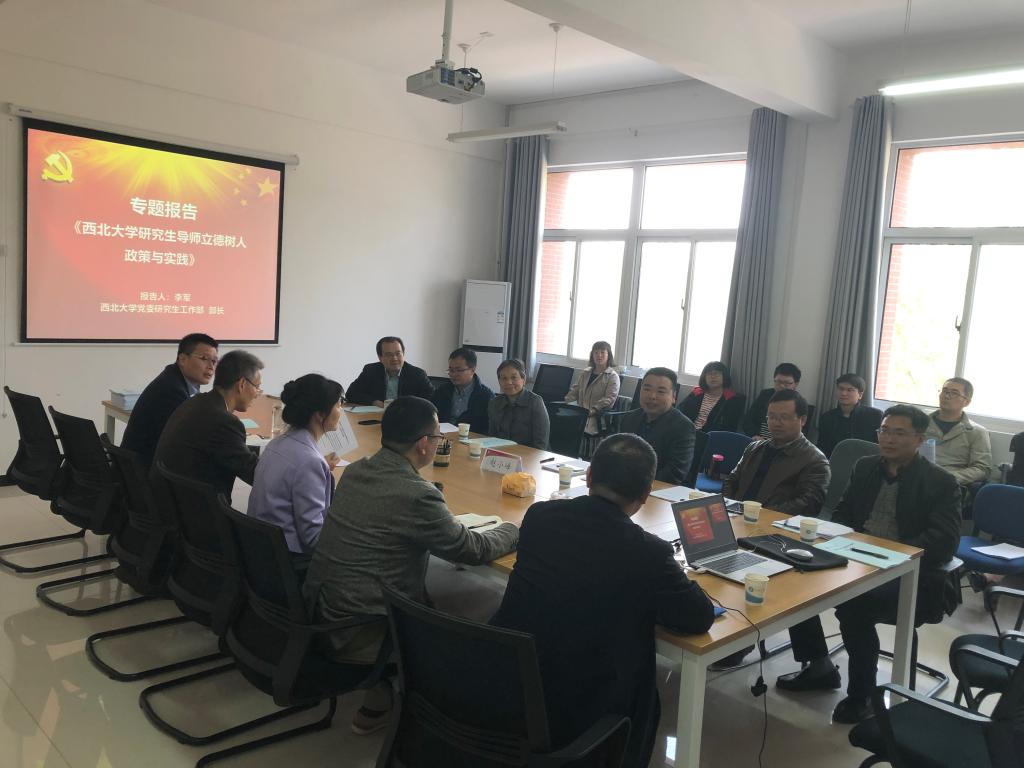 李军作了题为《建设高水平导师队伍,全面落实立德树人根本职责》的报告,他首先解读了《意见》出台的背景和主要内容,详细介绍了西北大学在研究生思想政治教育、导师队伍建设和研究生教育过程管理中的政策与实践经验,同时就如何做一名合格的研究生导师分享了个人的感悟和体会。他指出,研究生导师要珍惜导师荣誉、坚守职业情操、捍卫学术尊严,切实肩负起专业指导和德行教育的双重职责。报告结束后,与会教师就研究生奖助体系建设、思想政治教育、导师立德树人指标考核、过程培养质量与安全稳定、导师遴选培训、招生就业等问题与李军进行了探讨交流。
