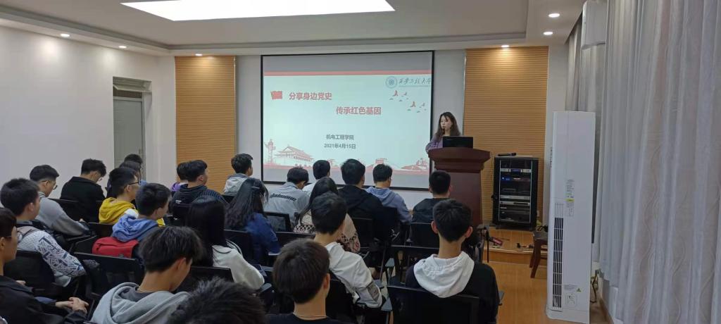 为深入开展党史学习教育,更好地传承红色基因,以积极进取,不忘先烈,坚持奋斗的姿态迎接中国共产党成立100周年,2021年4月15日晚,jdb电子中国官方网站在临潼校区笃行楼307报告厅举行“分享身边党史,传承红色基因”党史学习教育报告会。jdb电子中国官方网站辅导员李菁菁、研究生党员刘泽旭、王俊强、苏慧明做报告。jdb电子中国官方网站80余名本科生、研究生参加活动。