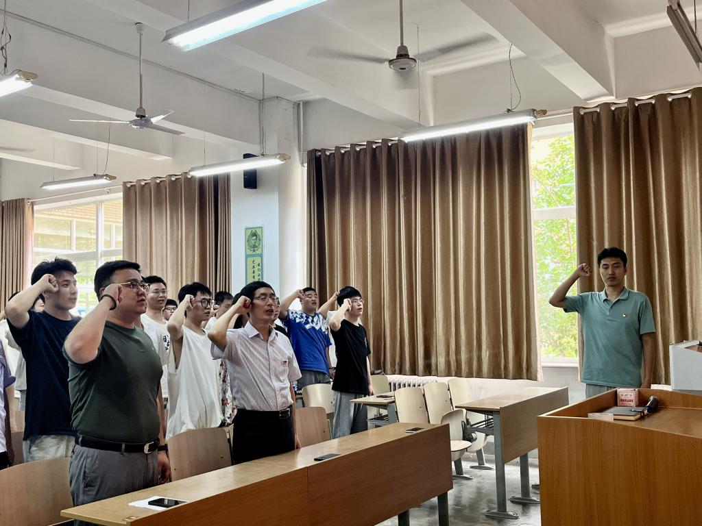 随后,在刘鹏老师的带领宣誓下,党员们举起右手、紧握拳头,在鲜红的党旗前庄严宣誓,党员们纷纷表示做到主动担当作为,带头遵守暑期留校各项规章制度,明确目标,为成就梦想而努力奋斗。