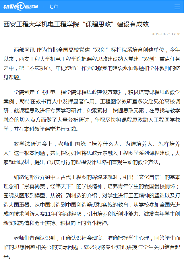 今年10月以来,学院工程图学教研室先后开展了两期课程思政教学法专题研讨活动,通过优化课程设计,以春风化雨、润物无声的方式激发学生的爱党爱国情怀和使命担当意识,弘扬“崇真尚美,经纬天下”的学校精神,传承深植于绵绵骊山的中华文化,将“三全育人”真正落到实处。