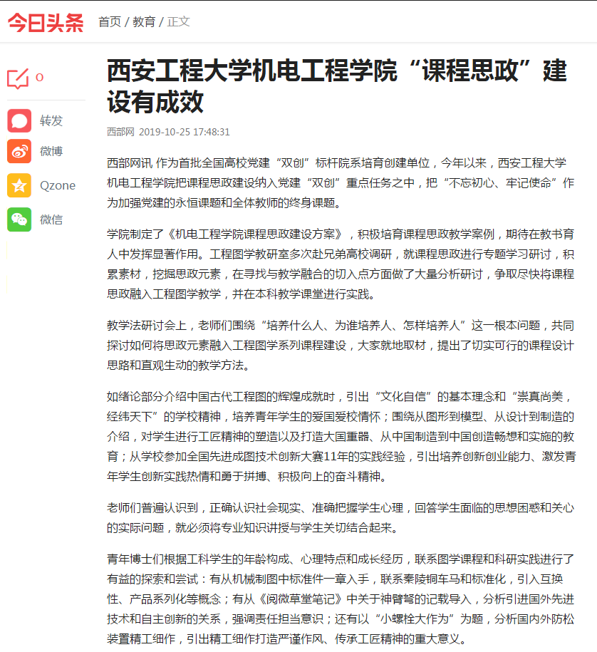 编者按:日前,人民日报海外网以《jdb电子中国官方网站开展主题教育》为题、西部网以《jdb电子中国官方网站“课程思政”建设有成效》为题、西安教育电视台以《jdb电子中国官方网站主题教育落实“三全育人”理念》为题对jdb电子jdb电子中国官方网站扎实开展主题教育、推进课程思政建设、构建“三全育人”格局进行了报道,今日头条给予转载。