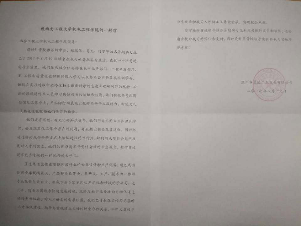 温州市蓝道工业发展有限公司创建于一九九四年,现已成为全球规模最大、产品种类最齐全,集研发、生产、销售为一体的专业眼镜包装企业。公司总部设在温州经济技术开发区滨海园区,下设印刷、浦东、浦西、龙湾四个分公司。公司拥有员工1300余人,曾多次来jdb电子进行人才招聘。实习期间,企业指定专人负责实习生的工作、学习、生活,确保实习效果和学生安全。实习生分别在企业生产部门、工程研发部门、IE工程和质量检验部门进行学习,并参与相关培训。学生在实习中发现工作中存在的问题,利用自己所学的专业知识提出建议,受到了企业高度赞扬。