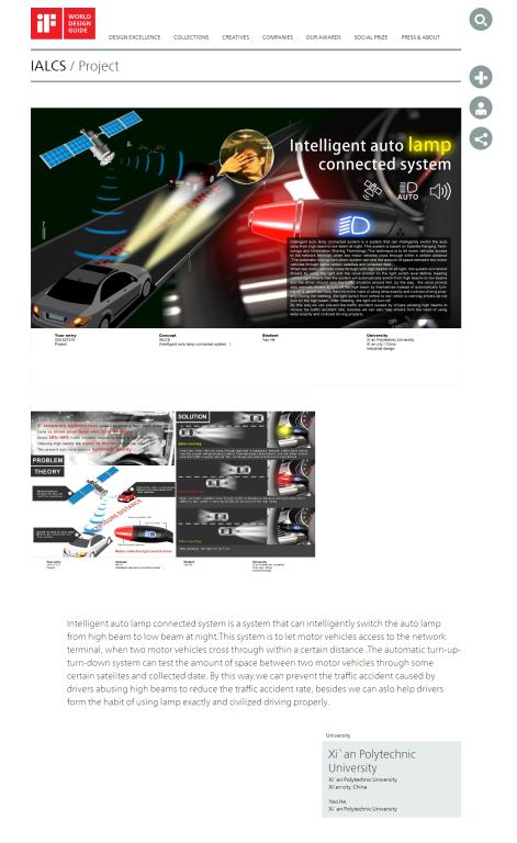 iF设计新秀奖是全球工业设计领域中规模最大、最具声望的新秀设计竞赛之一,评审团将iF标志授予全球最具天赋的年轻新锐设计师。贺尧同学的作品“智能互联远/近光灯切换系统(IALCS --Intelligent auto lamp connected system)”是一个自动智能切换汽车远/近光灯的系统,系统采用卫星测距,信息互联等技术,本系统使汽车接入互联网终端后,会车双方将各自灯光使用状态作为数据上传至网络终端,结合卫星测距得到的会车车距,由终端分析后发送指令给会车双方,双方系统接受指令,并自动控制本车远近光灯的使用状态。夜间会车时,系统通过灯光切换杆上的操作提示灯及语音提示告知司机,会车前会有黄灯警告注意关闭远光开启近光(或系统自动切换近光),并伴有语音提示,提醒注意周边路况,通过这种方式可以让司机养成正确用灯,文明驾驶的好习惯,会车时红灯表示禁止司机开启远光;待安全会车后,解除控制,司机可以自由控制灯光,保证了夜间的可视距离,避免了司机因滥用远光灯而引发的车祸,培养司机正确用灯,文明驾驶的好习惯,从而降低交通事故率。