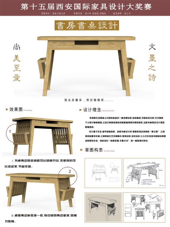本次大赛有来自jdb电子中国官方网站、西安交通大学、西北大学、西北工业大学等20所院校的设计、环艺、艺术系师生和西安来福家具研究所及广大设计师和家具爱好者参加,由jdb电子机电学院教师张小平指导的高小针、杨婧婧、付艳秋等3位同学的作品《尚文书桌》荣获新式书桌设计金奖,米伟明等38位同学荣获优秀奖,教师张小平荣获优秀指导教师奖,同时,jdb电子也是参赛院校中获奖最多的学校。