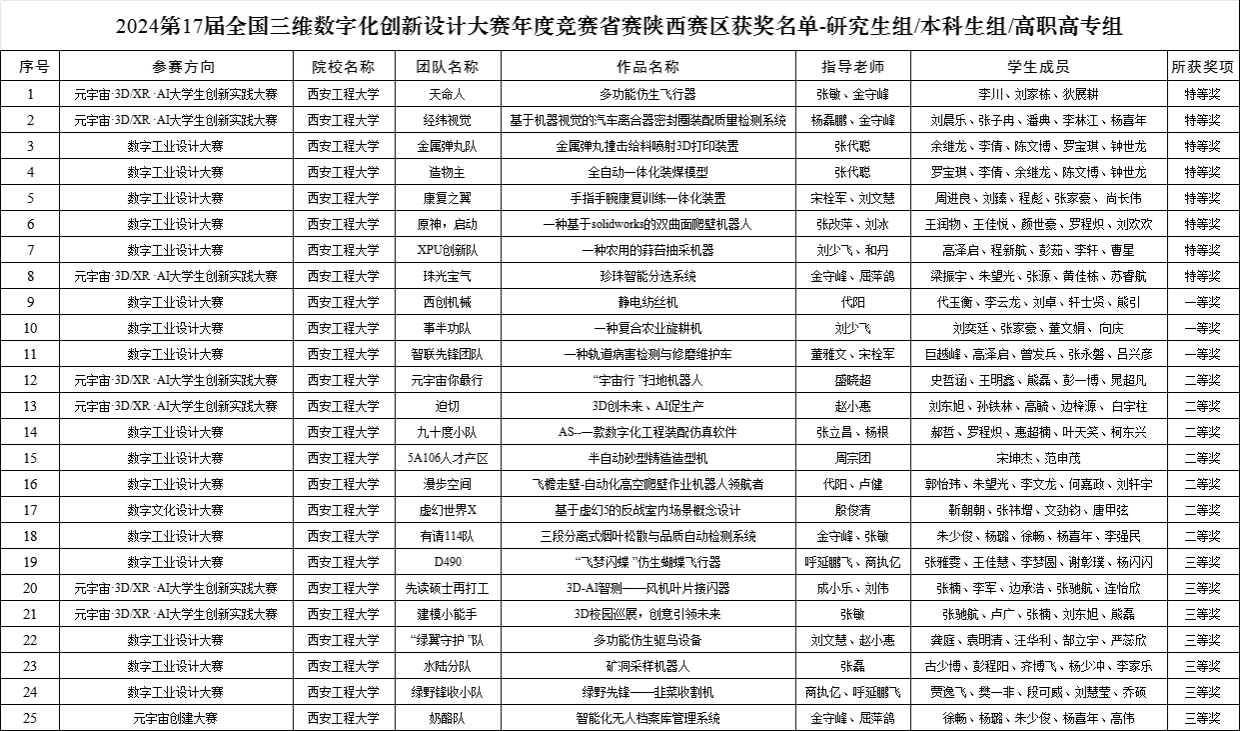 第17届全国三维数字化创新设计大赛陕西赛区竞赛近日举行,jdb电子学子获得特等奖8项、一等奖3项、二等奖7项、三等奖7项,获得特等奖的队伍入围全国总决赛,是jdb电子该项赛事举办以来取得的最好成绩。