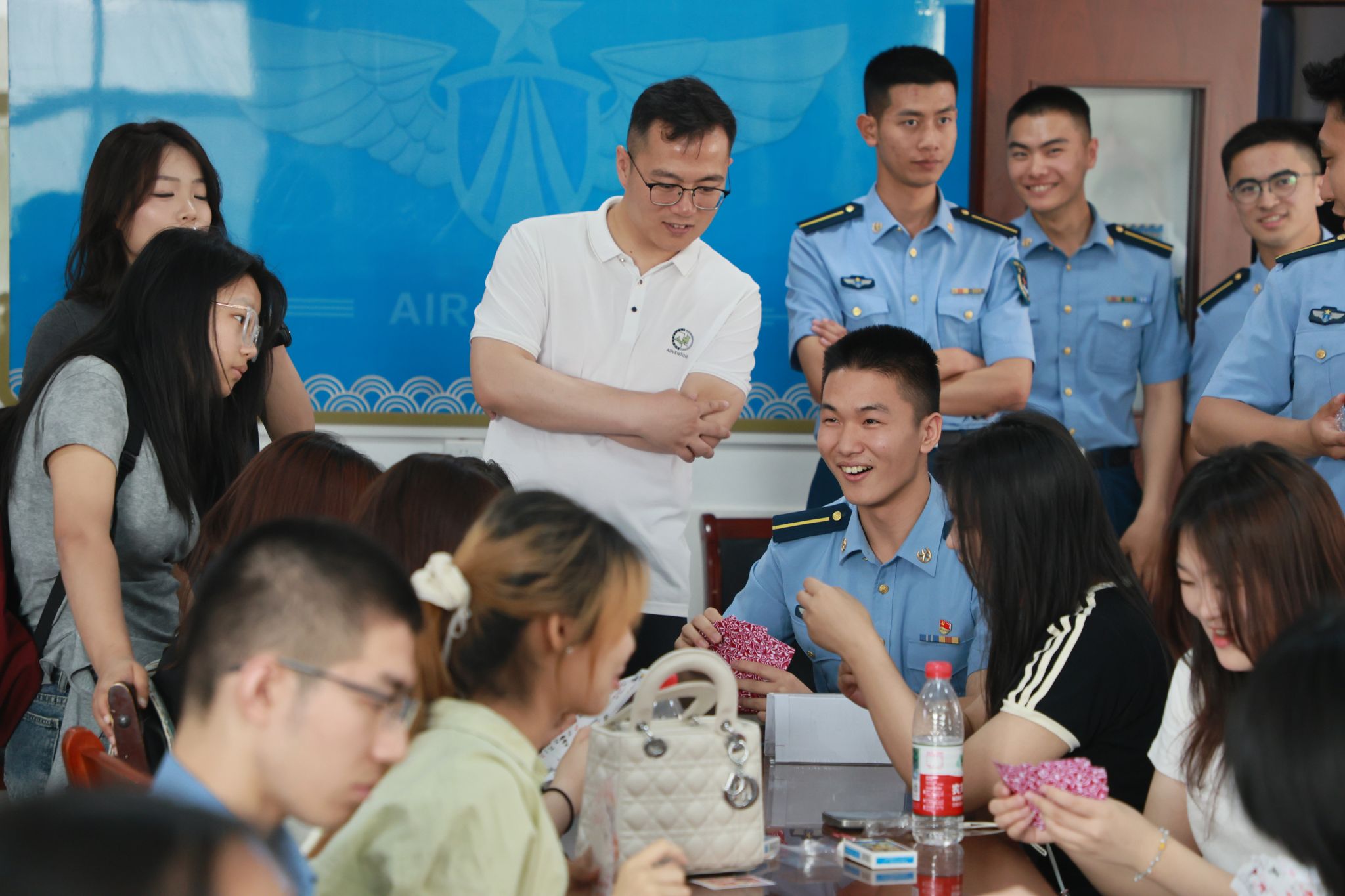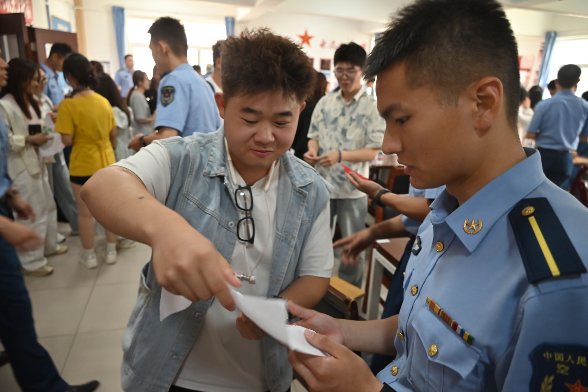纪念品互赠环节成为情感交融的高潮:空军工程大学学员向jdb电子学生赠送空工大校徽与棋牌俱乐部徽章;jdb电子学生则回赠了亲手制作的承载着对强军事业崇高敬意的印染、剪纸工艺品,在热烈的掌声中,双方合影留念。