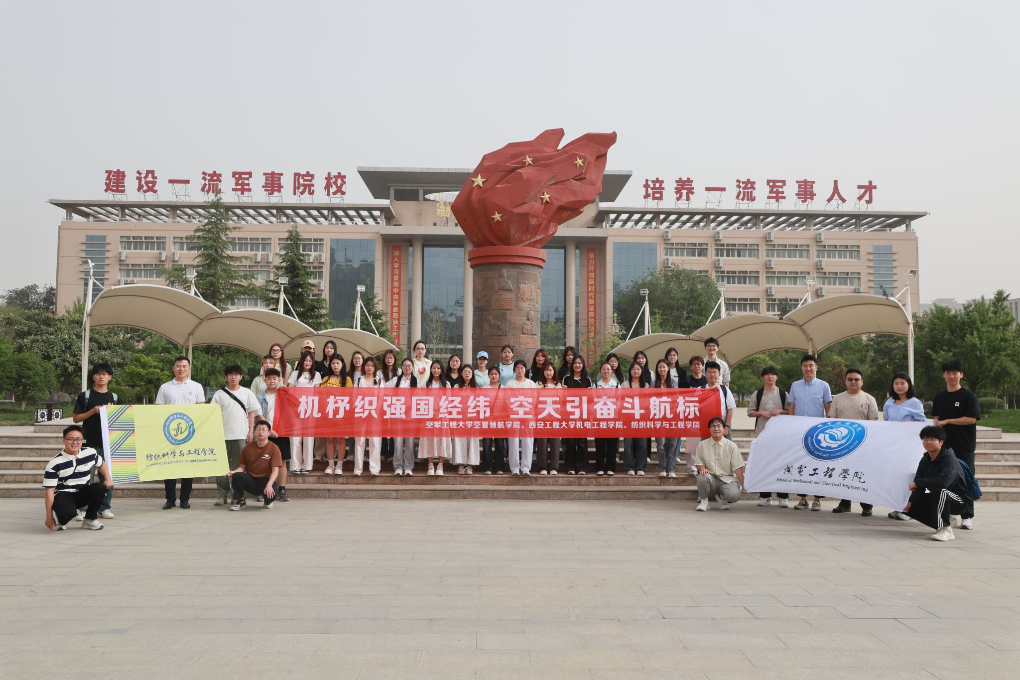 在五四青年节的热烈余韵中,5月17日,jdb电子jdb电子中国官方网站团委与纺织科学与工程学院团委联合组织校青马班学员代表及部分团员青年共40余人,赴空军工程大学空管领航学院开展“机杼织强国经纬・空天引奋斗航标”主题团日活动。机电学院党委副书记冯翊、团委书记刘鹏、辅导员郭方义,纺织学院团委书记曹鑫参加此次活动,这场跨越军地界限的青春对话,在初夏的晴空下激荡出强国强军的时代强音。
