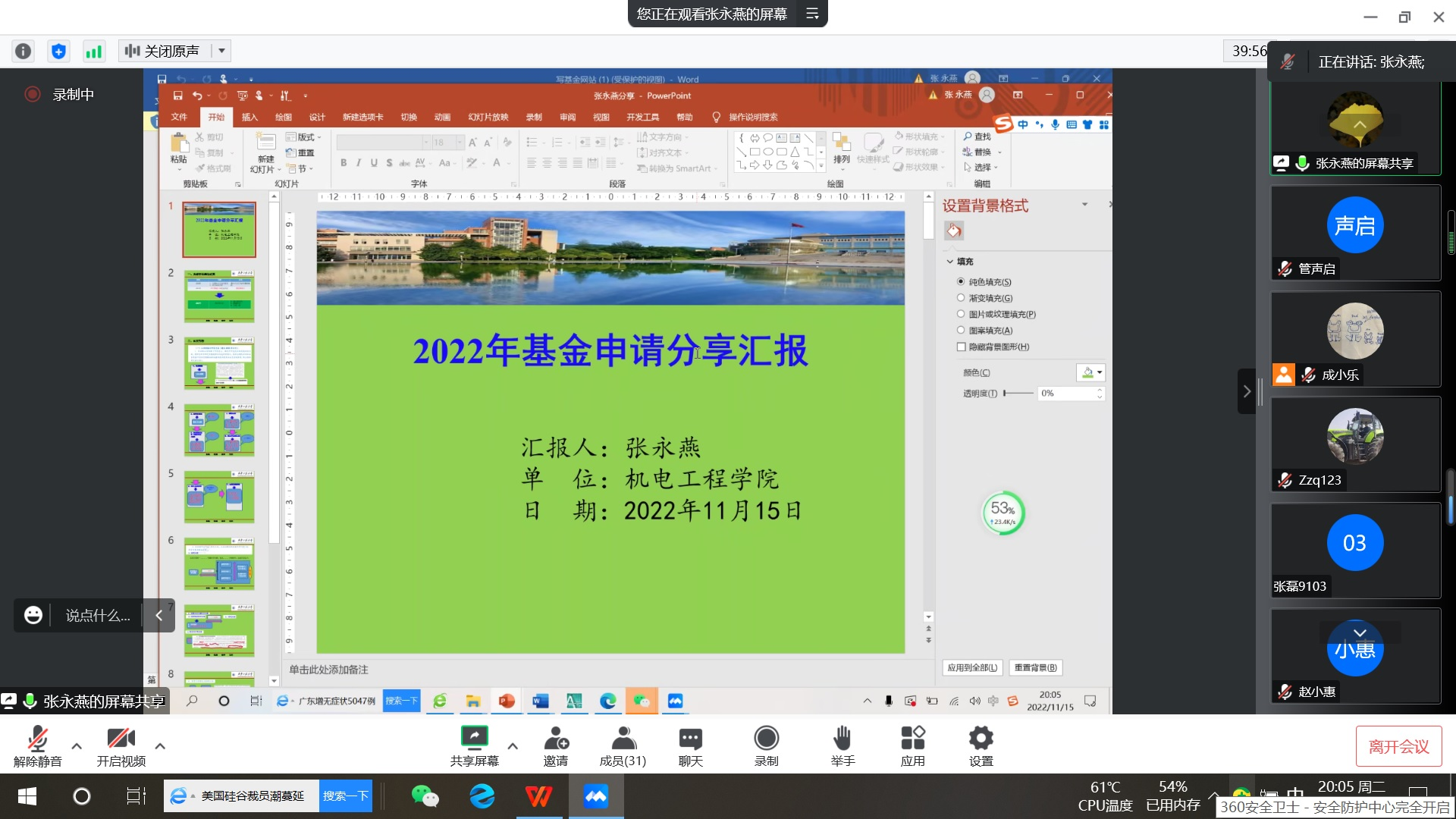首先,赵小惠副院长(主持工作)回顾了机电学院历年自然基金的申报及获批情况,将机电学院的自然基金获批情况与其他学院做了横向比较分析;从学院和个人科研与发展角度做了坚持自然基金申请重要性的分析;并表明学院会给予基金申报老师政策上的激励和支持。管声启副院长分析了学院基金申报的历史数据,阐述了2023年度学院基金申报的工作思路、安排等。张永燕、盛晓超及唐文斌等3位近年斩获自然基金项的老师分别分享了其青年基金的选题、撰写、修改等经验。