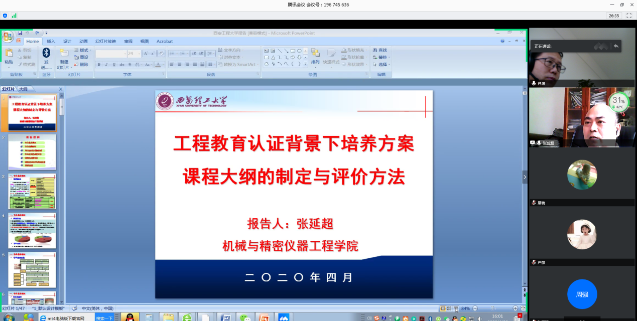 张延超首先应邀作了题为《工程教育认证背景下培养方案、课程大纲的制定与评价》的线上报告。张延超以西安理工大学机械设计制造及自动化专业为例,对基于工程教育背景下培养方案制定过程中培养目标的制定、培养目标合理性评价与修订机制、毕业要求及达成度评价、课程体系及课程达成度评价、课程教学大纲的撰写、课程目标及课程评价内容及评价方法等内容进行了系统解读。他重点针对课堂质量评价与改进中课程对毕业要求指标点的支撑理由、教学环节支撑课程目标及考核情况、课程目标达成考核及评价方式、课程目标达成评价结果、课程持续改进报告撰写等作了详细阐述。