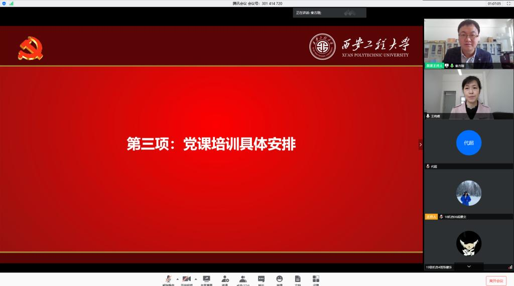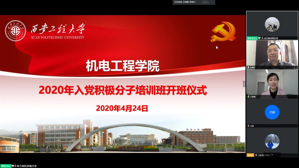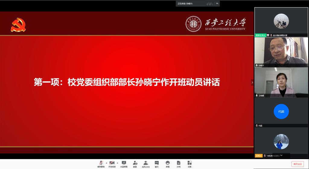 孙晓宁代表学校党校向在疫情防控特殊时期参加线上入党积极分子培训班的各位学员表示祝贺,对培训班学员提出三点意见:一是要端正态度,正确认识参加入党积极分子培训班的重要意义。入党积极分子要不断通过对党史党章、党的理论知识、党内新政策法规等内容的集中学习,深化对党的性质、纲领、指导思想的认识,进一步端正入党动机,规范行为实践。二是要坚定信念,以优异的成绩接受党的考验。入党积极分子要自觉把坚定共产主义理想信念同脚踏实地的学习统一起来,树立正确的人生态度和价值追求,不断增强对学习重要性的认识、增强社会责任感和使命感、增强运用知识解决实际问题的能力,在实践中接受党的考验。三是要严格要求,确保圆满完成学习培训各项任务。入党积极分子要遵守纪律,以高标准、严要求加强自身党性修养和实践锻炼,确保学有所获;学院党委要加强管理,精心做好党课培训班的组织工作,使学员们在理论修养、思想素质和意志品质等方面得到显著提高。