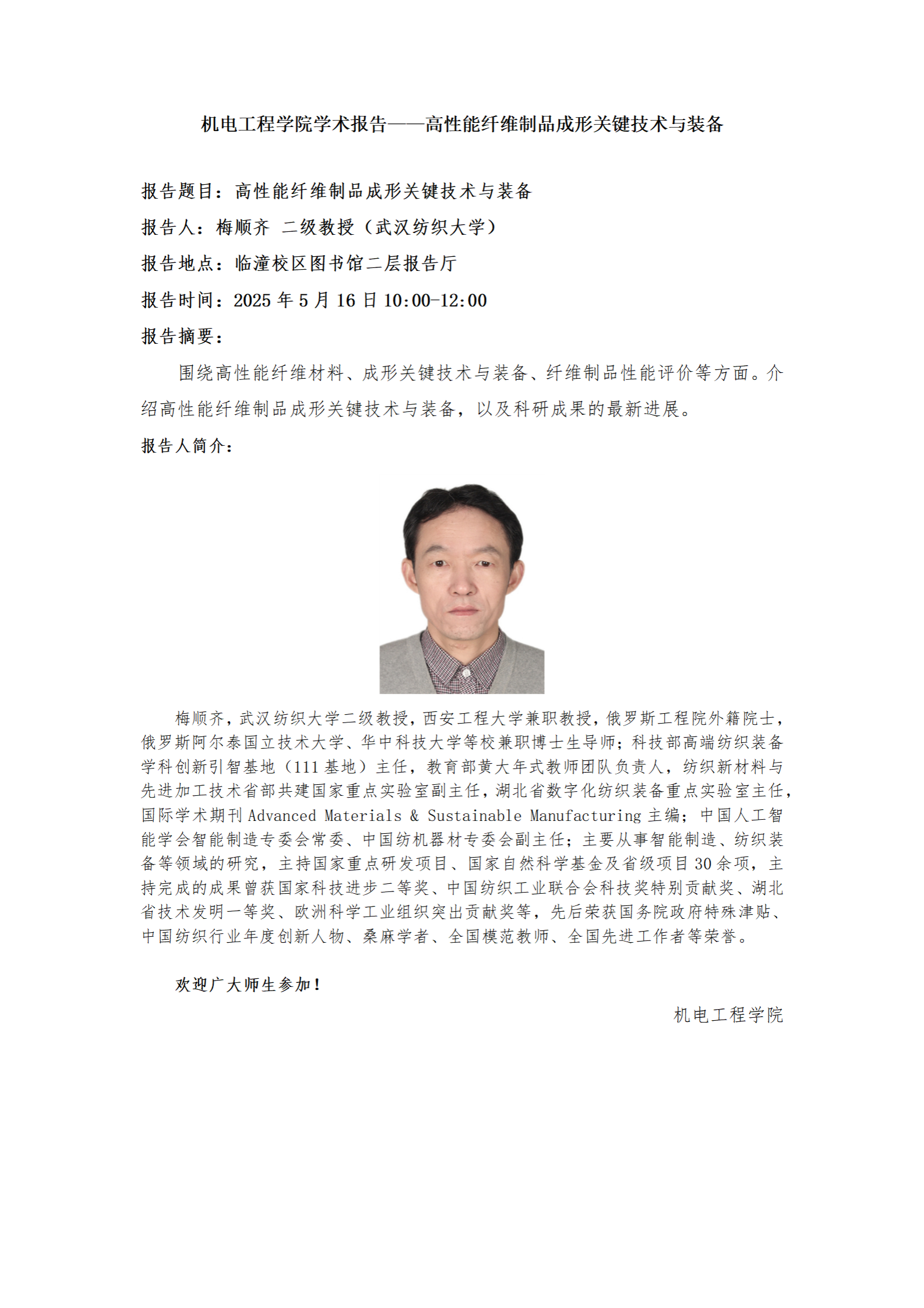 jdb电子中国官方网站学术报告——高性能纤维制品成形关键技术与装备