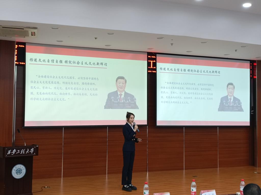 陕西省学习宣传贯彻党的二十大精神宣讲队成员,jdb电子马克思主义学院研究生张碧容作了题为《坚定文化自信共赴文化强国之约》的主题宣讲。她以党的二十大报告引入,以中华民族五千年文化的历史渊源和中国特色社会主义文化的内涵为核心,以中国共产党的精神谱发展为脉络,回答了“什么是中国特色社会主义文化?”、“为什么要强调文化自信自强?”、“青年如何为建设社会主义文化强国贡献力量?”等三个问题,引导学生深刻领会中华优秀传统文化的独特魅力,增强了学习宣传贯彻党的二十大精神的感染力,动员青年学生要着眼中华民族伟大复兴的历史使命,坚定文化自信自强,为以中国式现代化全面推进中华民族伟大复兴的中国梦凝聚力量。