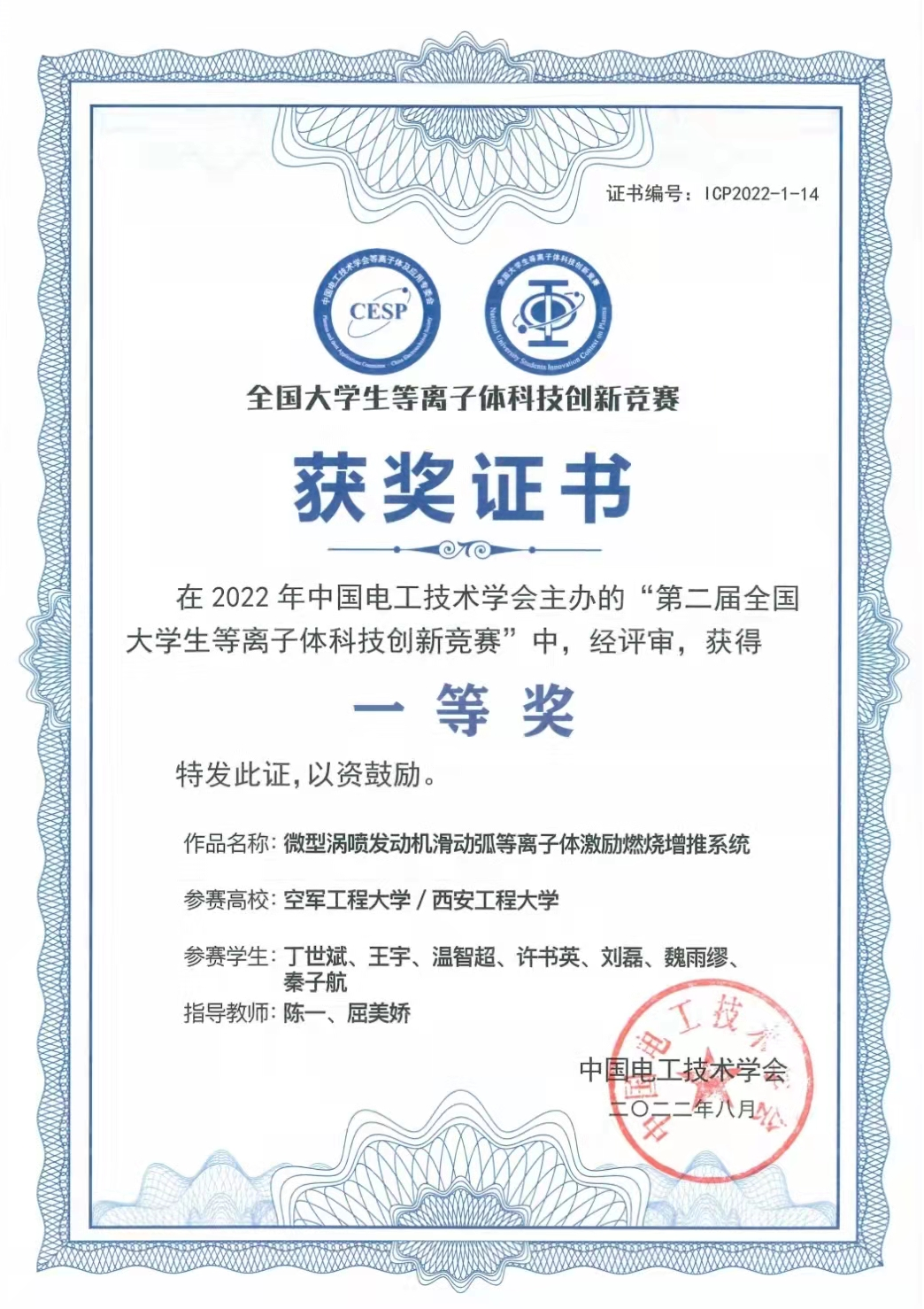 2022年9月6日,第二届全国大学生等离子体科技创新竞赛落下帷幕。jdb电子jdb电子中国官方网站与空军工程大学联合参赛的项目“微型涡喷发动机滑动弧等离子体激励燃烧增推系统”获全国一等奖,系jdb电子首次参加该项赛事。