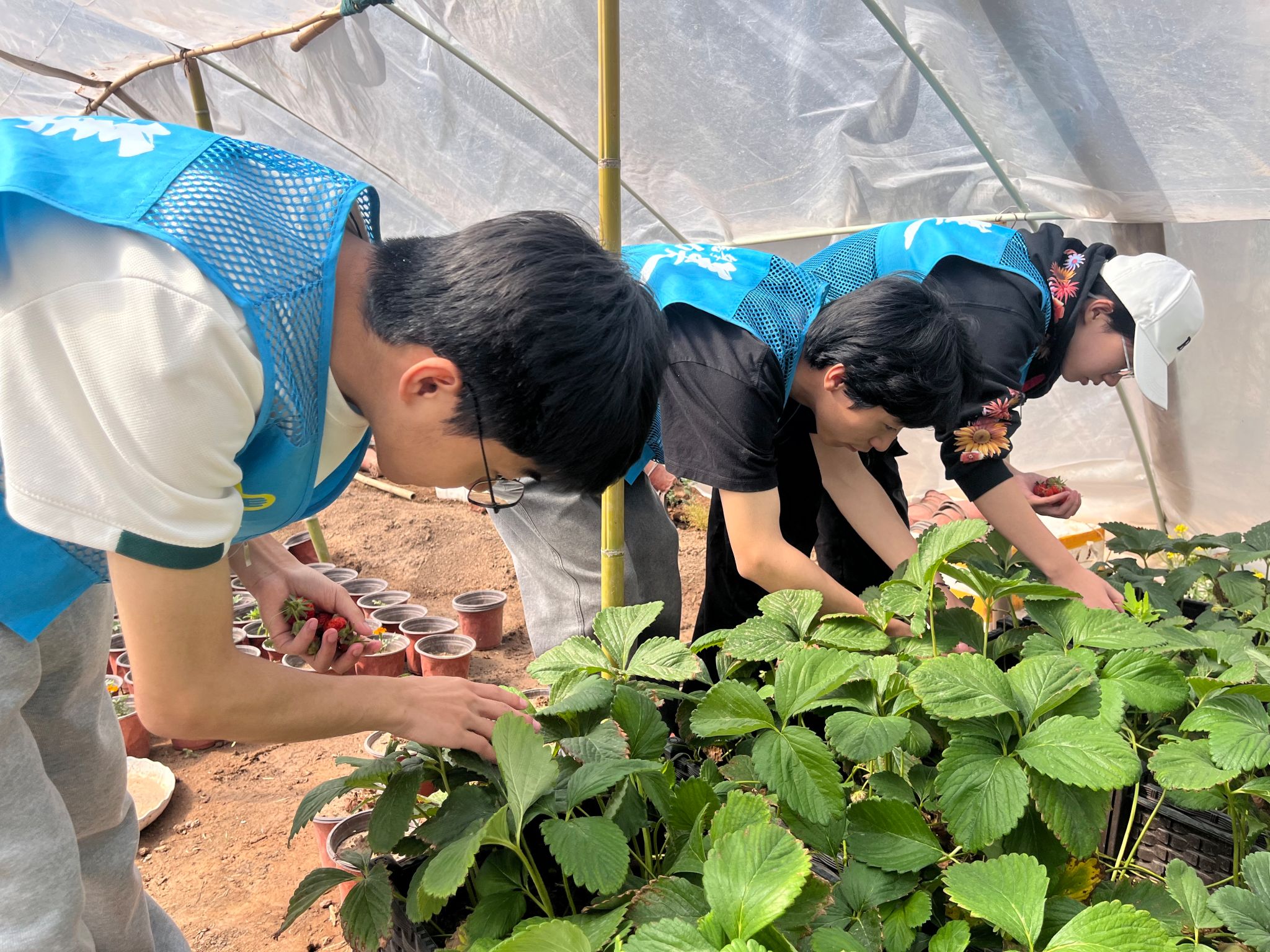 此次活动所采摘的草莓,源自2024年10月机电工程学院学生于耕读小园内亲手栽种的草莓苗。在学院劳动教育导师于增利老师的指导下,历经半年多的悉心培育,草莓苗茁壮成长,最终迎来丰收。活动过程中学生有序穿行于草莓丛间,按照标准流程采摘成熟果实,现场氛围热烈序。在采摘过程中,于增利老师还就草莓种植养护与学生展开交流,展现出良好的专业素养与实践能力。